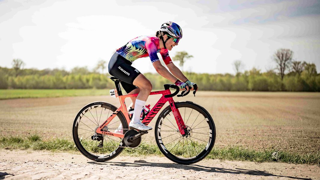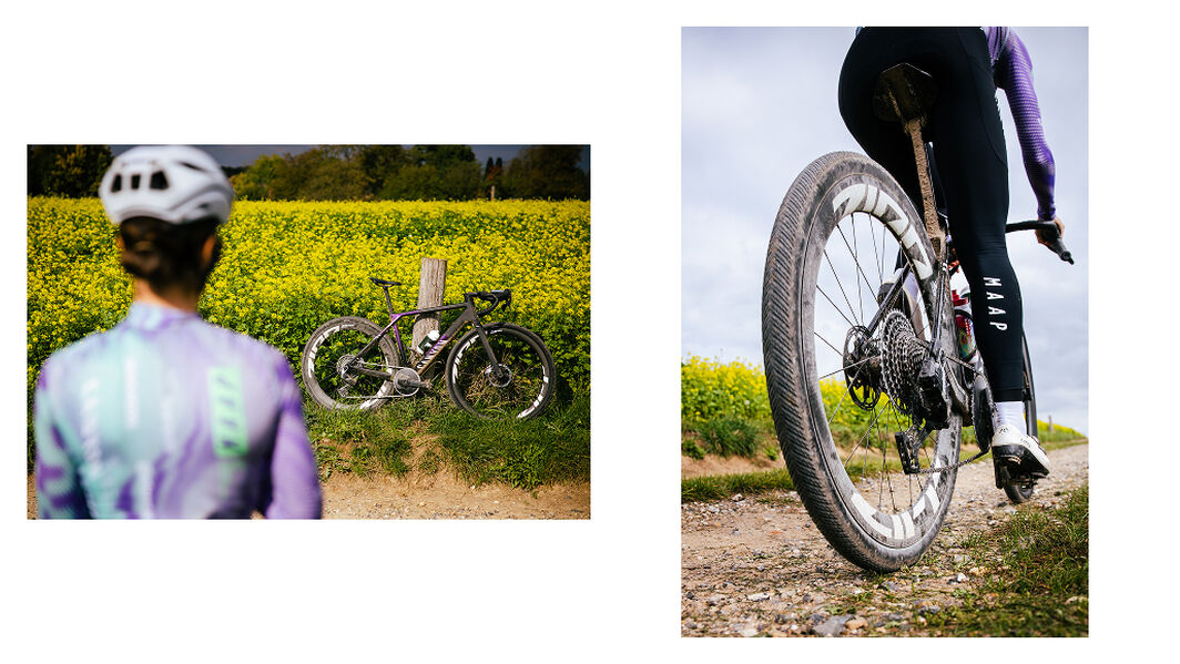 Rosa races the Grail CFR AXS on the gravel, and the Aeroad CFR AXS on the road.
